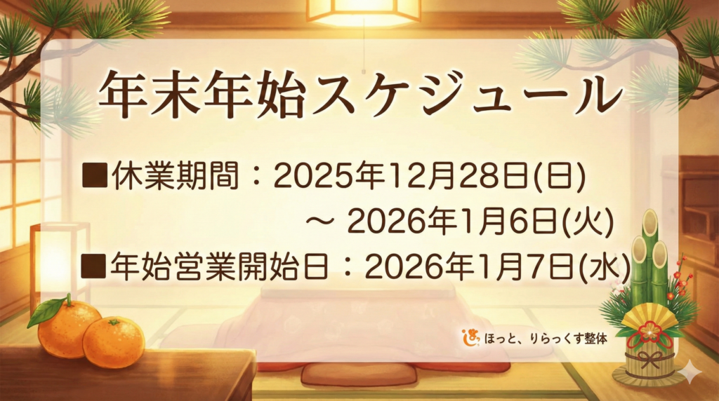こんにちは。 沼津市原の《ほっと、りらっくす整体》です。 早いもので、今年も残すところあとわずかとなりました。 本年も多くの皆様にご来店いただき、心より感謝申し上げます。 誠に勝手ながら、年末年始の休業期間を下記の通りと […]
